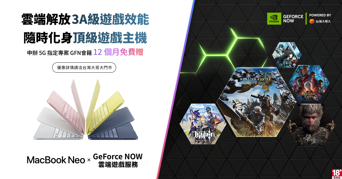 現在只要申辦台灣大哥大 AppleMac 指定專案,即可享 GeForce NOW 鈦金方案時數制服務12 個月免費優惠,